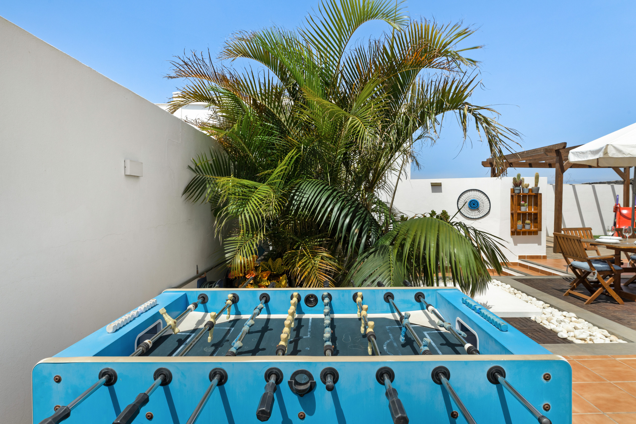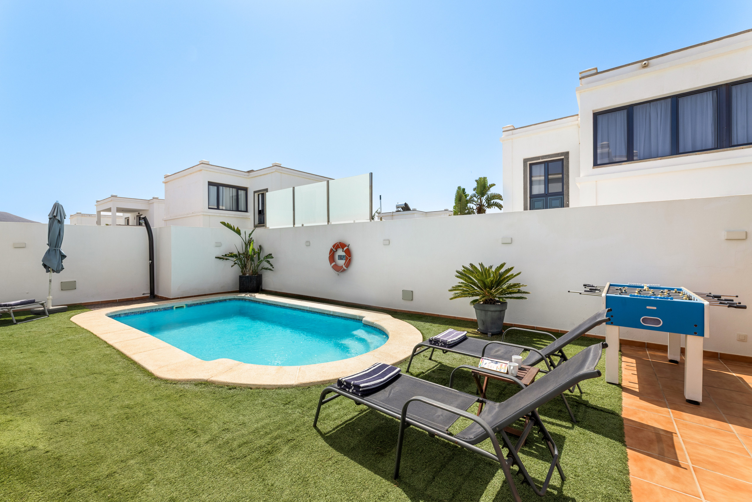 La villa en Playa Blanca posee 3 dormitorio(s) y capacidad para 6 personas. Alojamiento de 117 m² bonito y totalmente equipado, con vistas al jardín y a la piscina. Se encuentra a 1 km de la playa de arena "Playa de la Campana", 2 km de la playa de arena "Playa Flamingo", 2 km de la playa de arena "Playa de Montaña Roja", 2 km de la playa de arena "Playa Dorada", 16 km del parque natural "Parque Nacional de Timanfaya", 23 km del aeropuerto "Aeropuerto Cesar Manrique" y está ubicado en una zona tranquila y en el complejo residencial.Dispone de jardín, mobiliario jardín, parcela vallada, 31 m² de terraza, lavadora, barbacoa, plancha, caja fuerte, acceso internet (wifi), secador, aire acondicionado, piscina climatizada privada, parking aire libre en mismo edificio, 1 Televisor, tv satelite.La cocina, está equipada con nevera, microondas, horno, congelador, lavavajillas, vajilla/cubertería, utensilios/cocina, cafetera, tostadora y hervidor de agua.