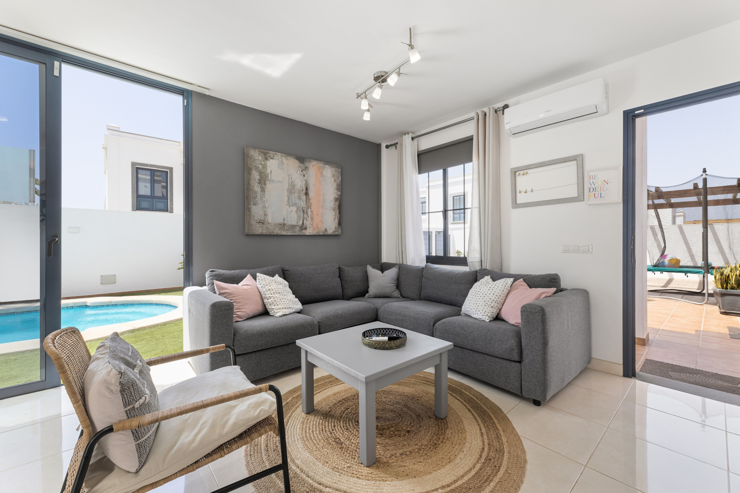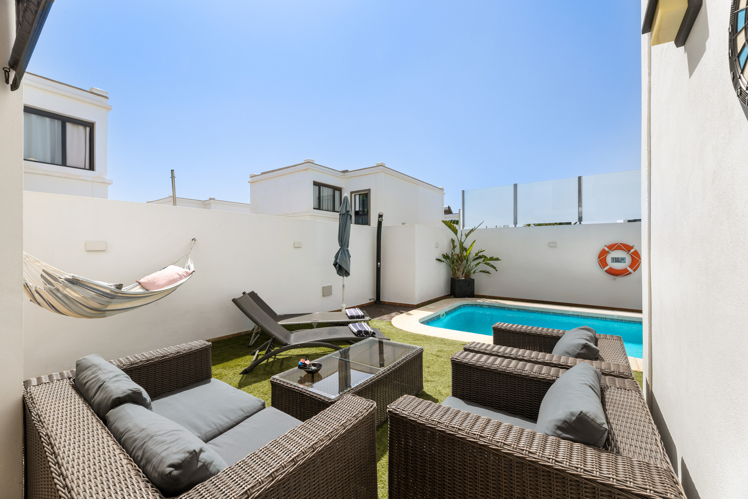 Villa Zafiro 17: located just 150 metres from the sea, it is a spacious duplex with a private pool that can be heated for an additional charge. The villa is bright and has a living-dining area with a sofa and flat-screen TV. The fully equipped kitchen includes a fridge, oven, ceramic hob, dishwasher and microwave. The villa has a terrace with a washing machine and ironing utensils. It also has a terrace with sun loungers and a barbecue. A car is required. Lanzarote airport is 40 minutes away by car.
